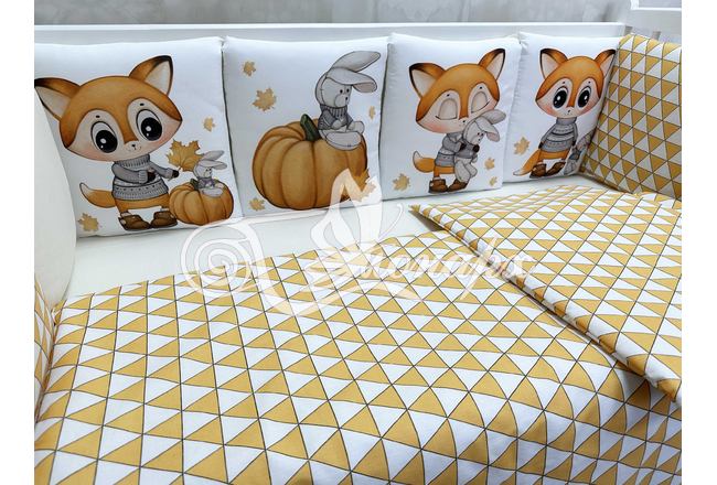Бортик составной: 12 подушек 31х34 см на замочках упакованы в сумку-переноску.