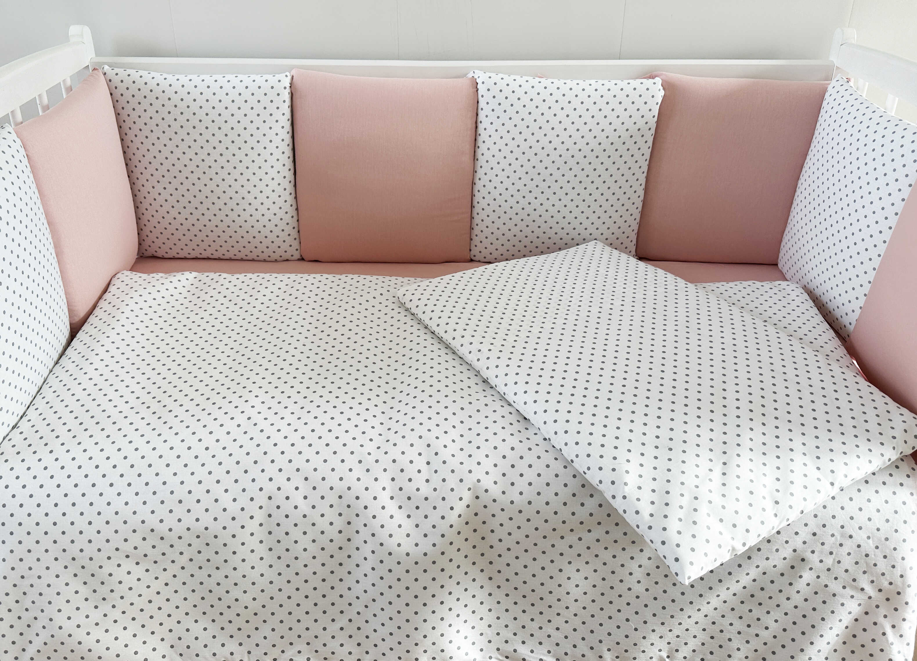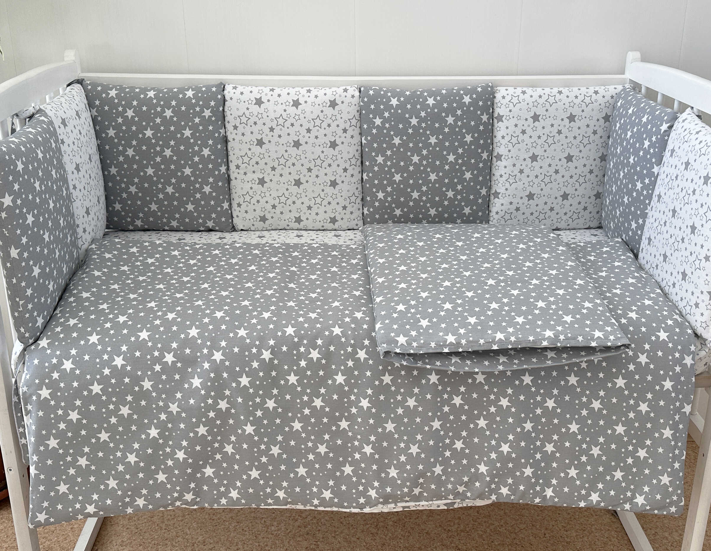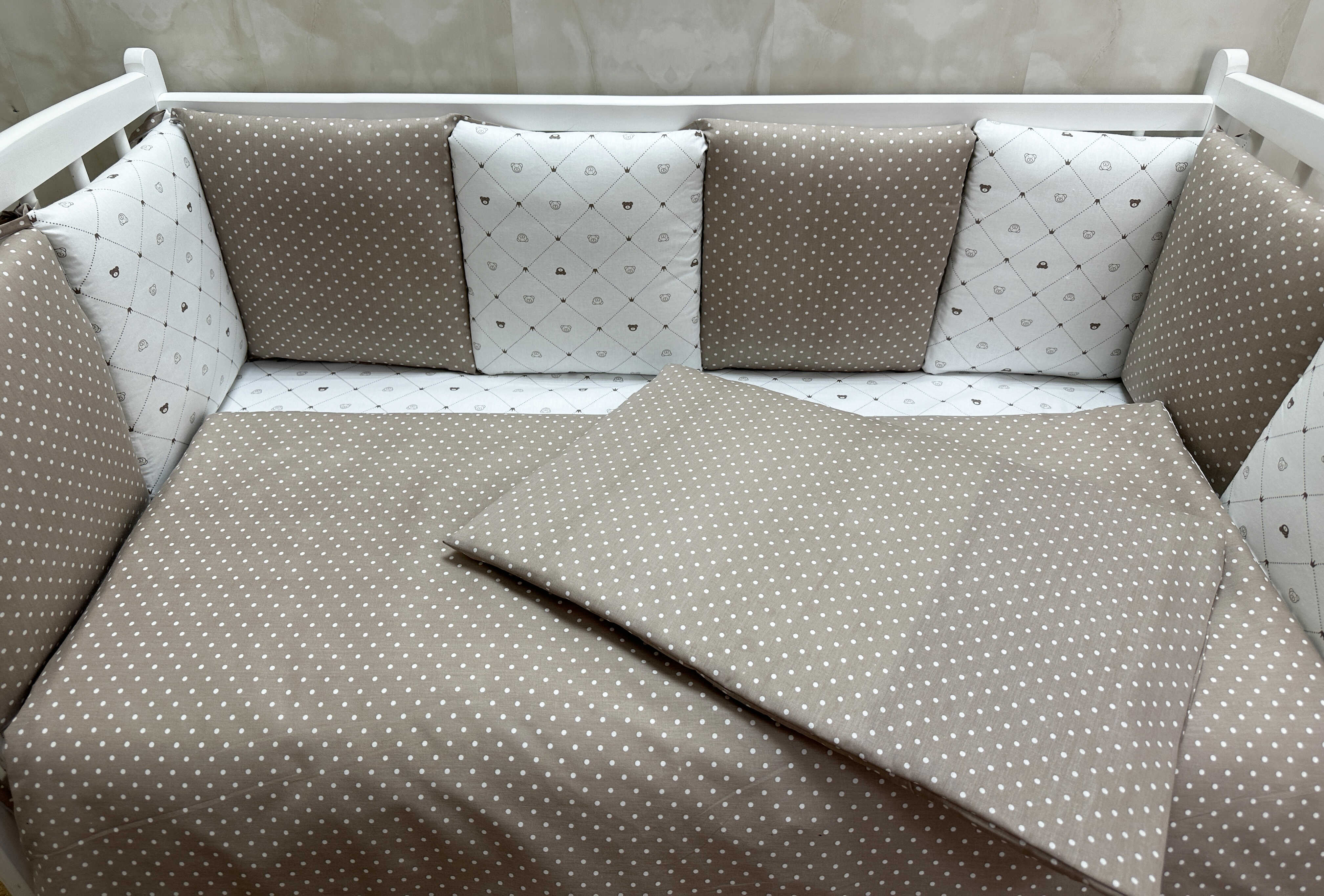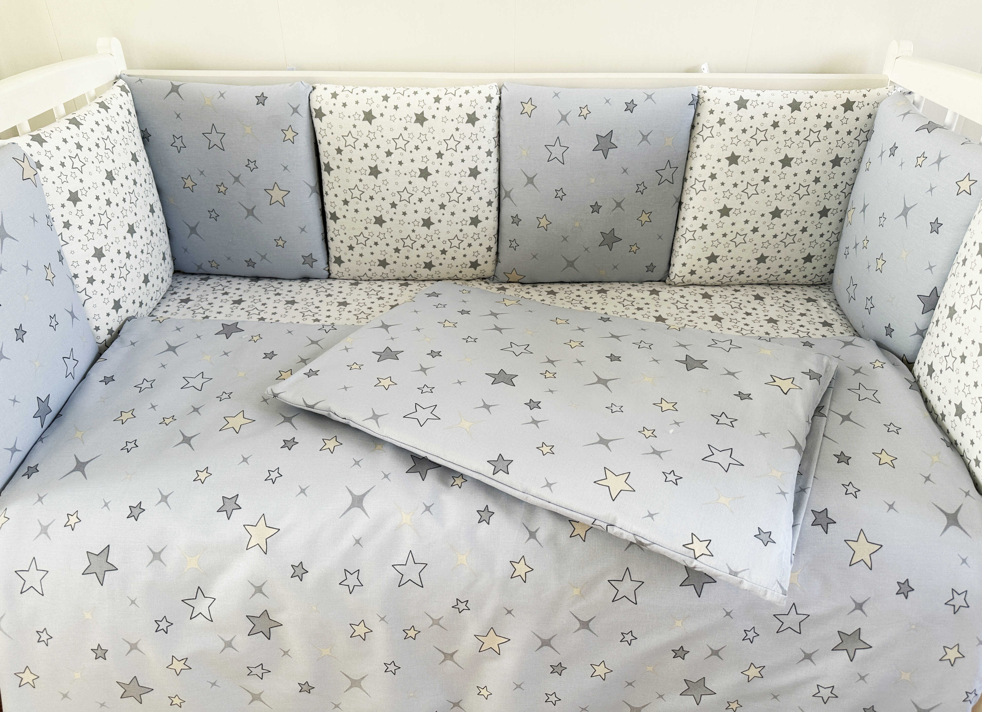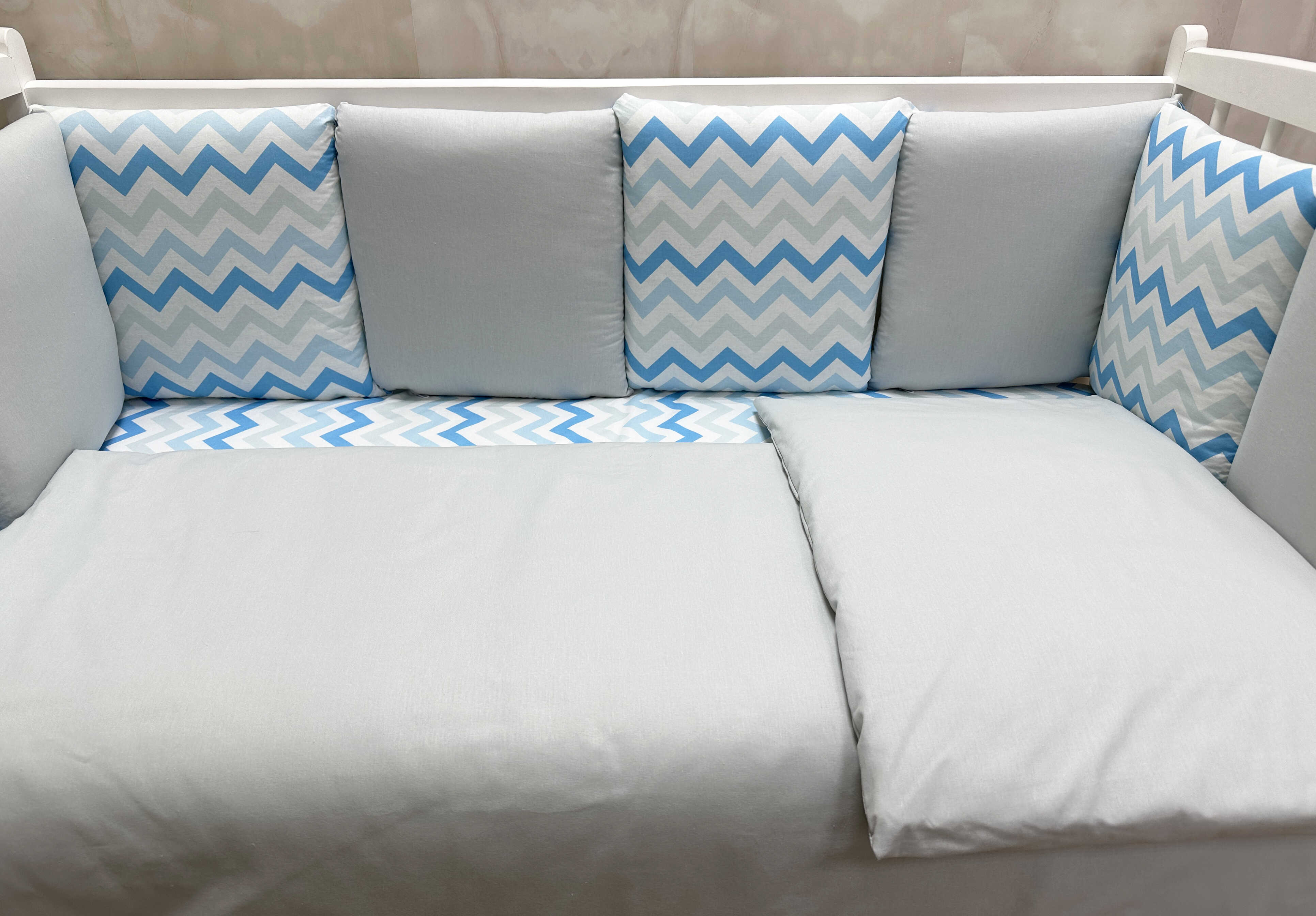 Комплекты в детскую кроватку для новорожденных с бортиками подушечками