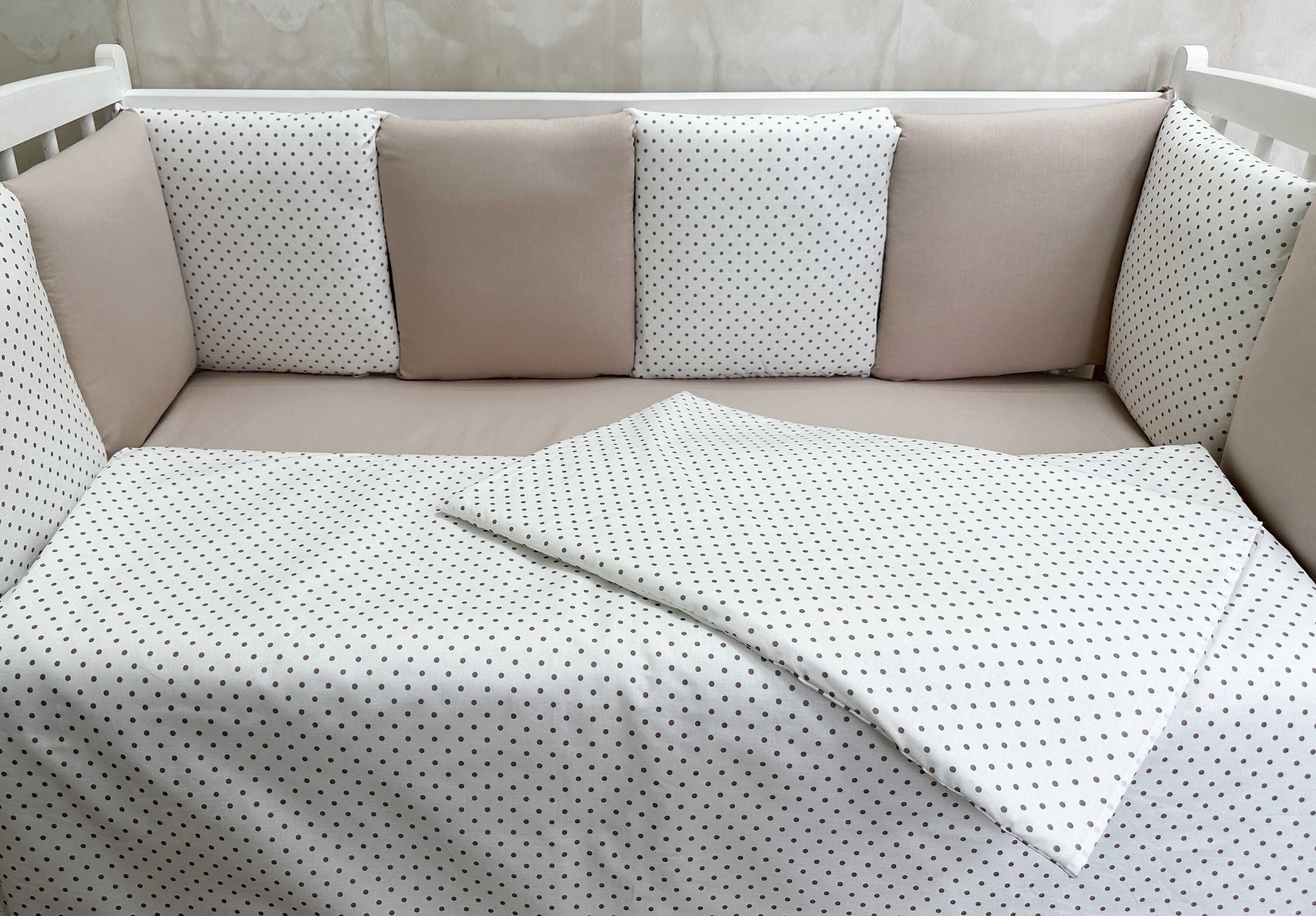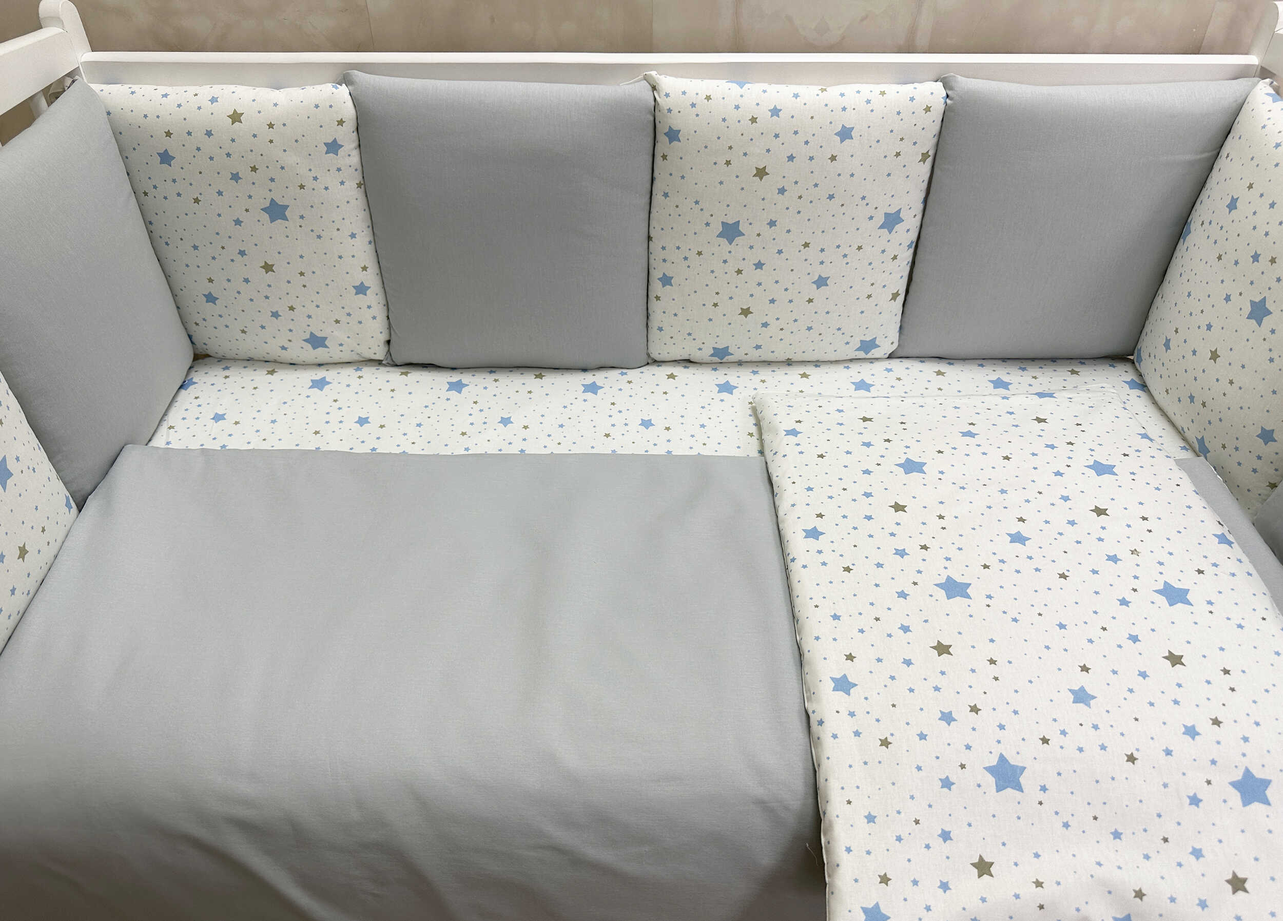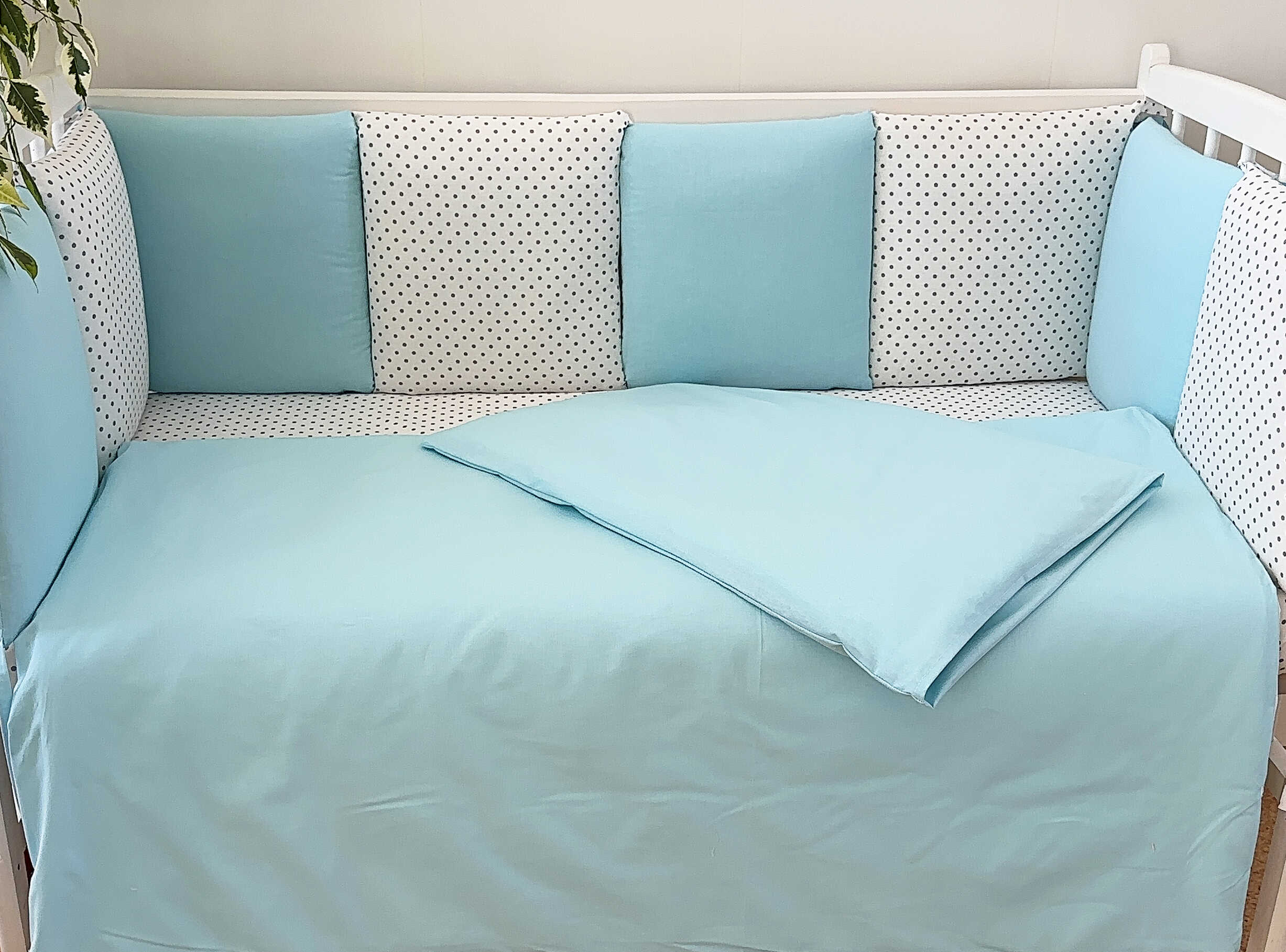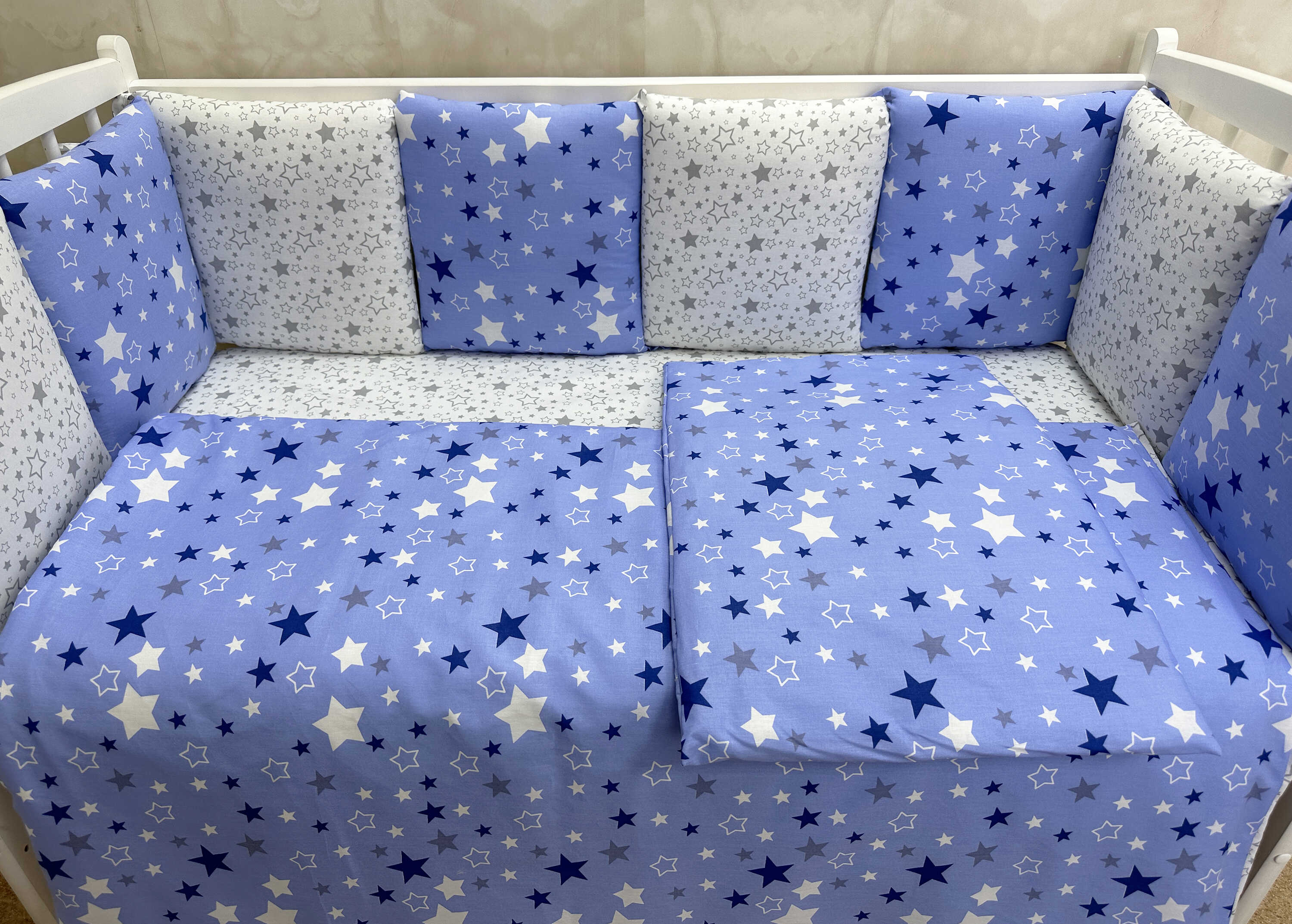 Комплекты в детскую кроватку для новорожденных с бортиками подушечками