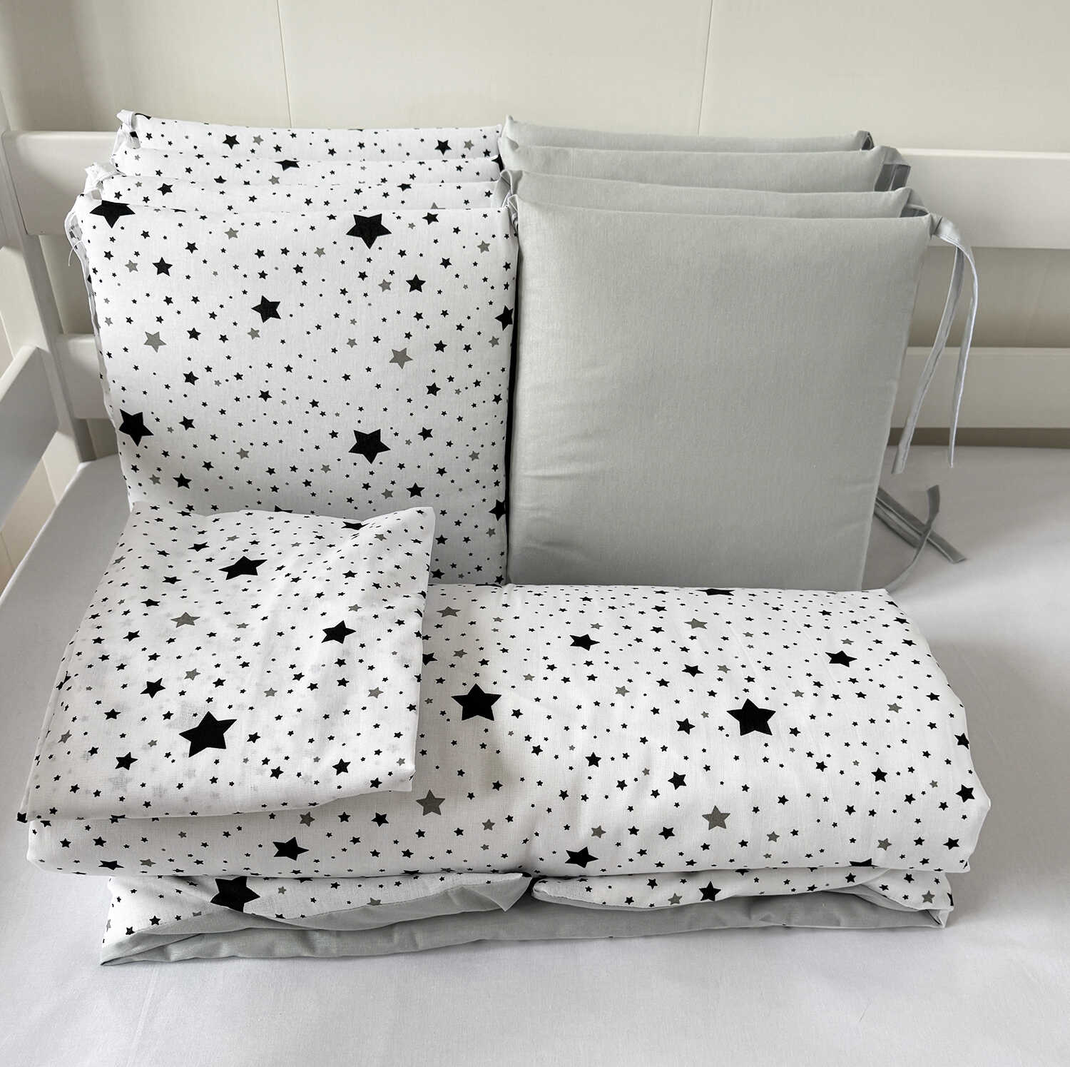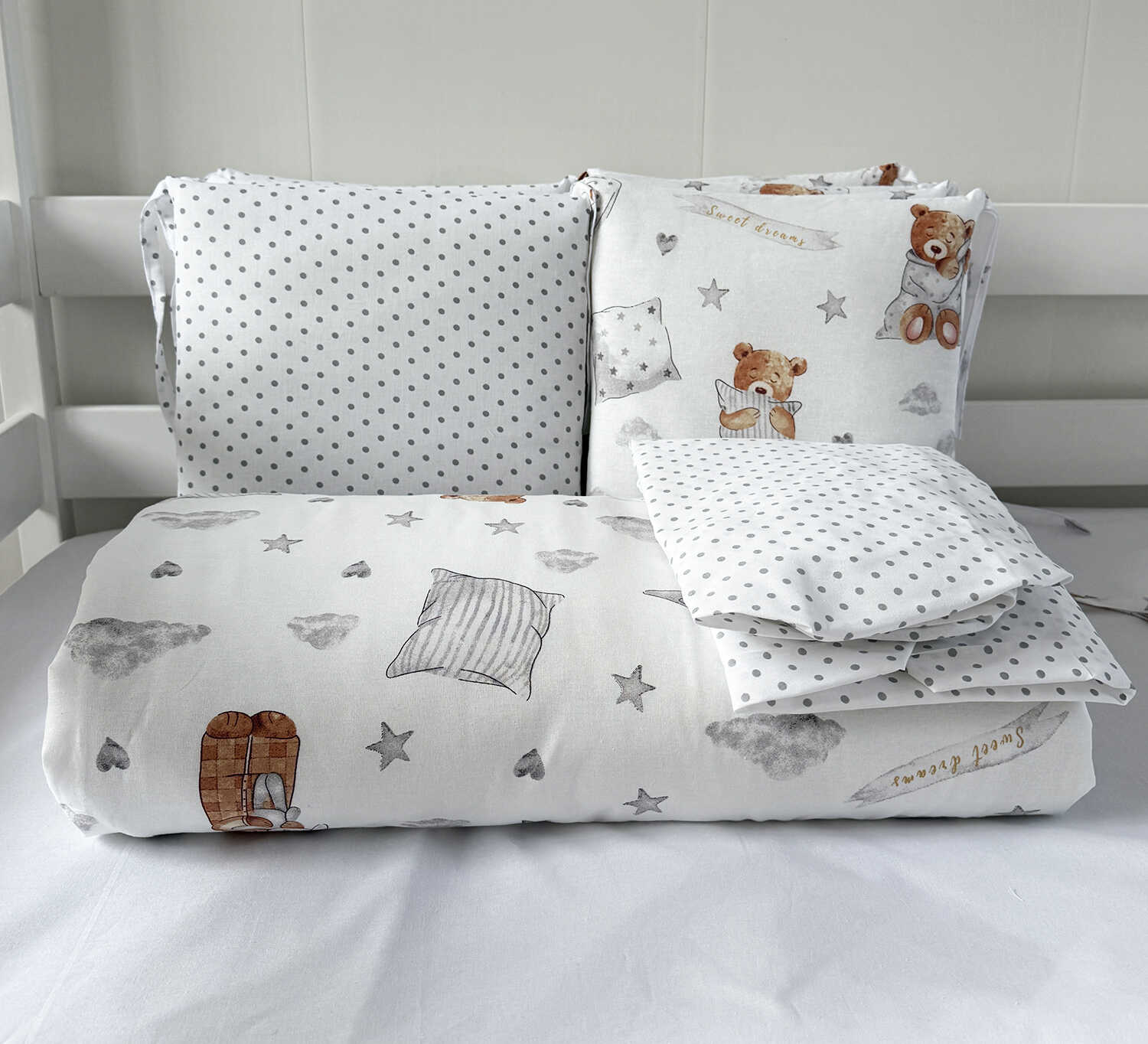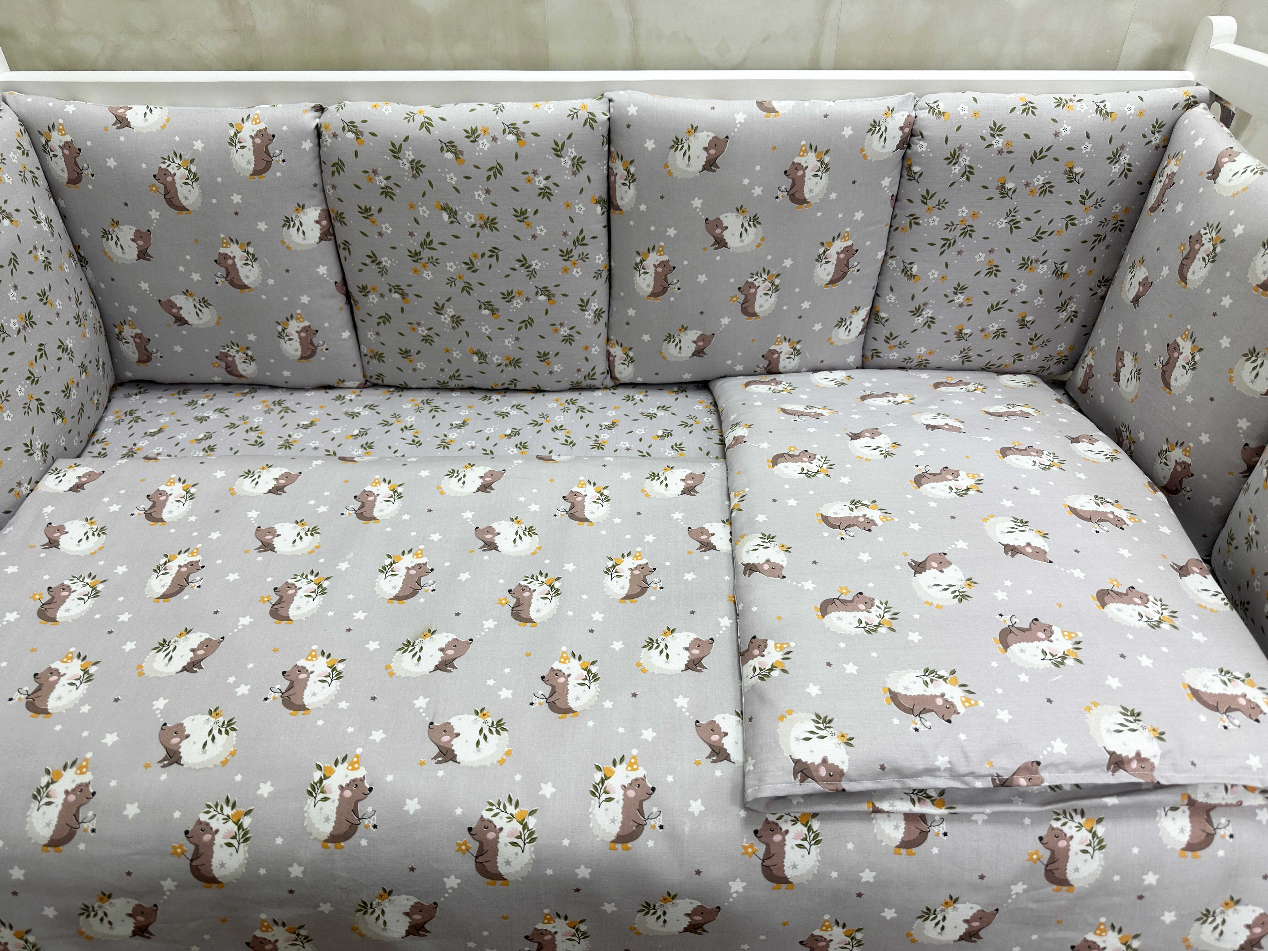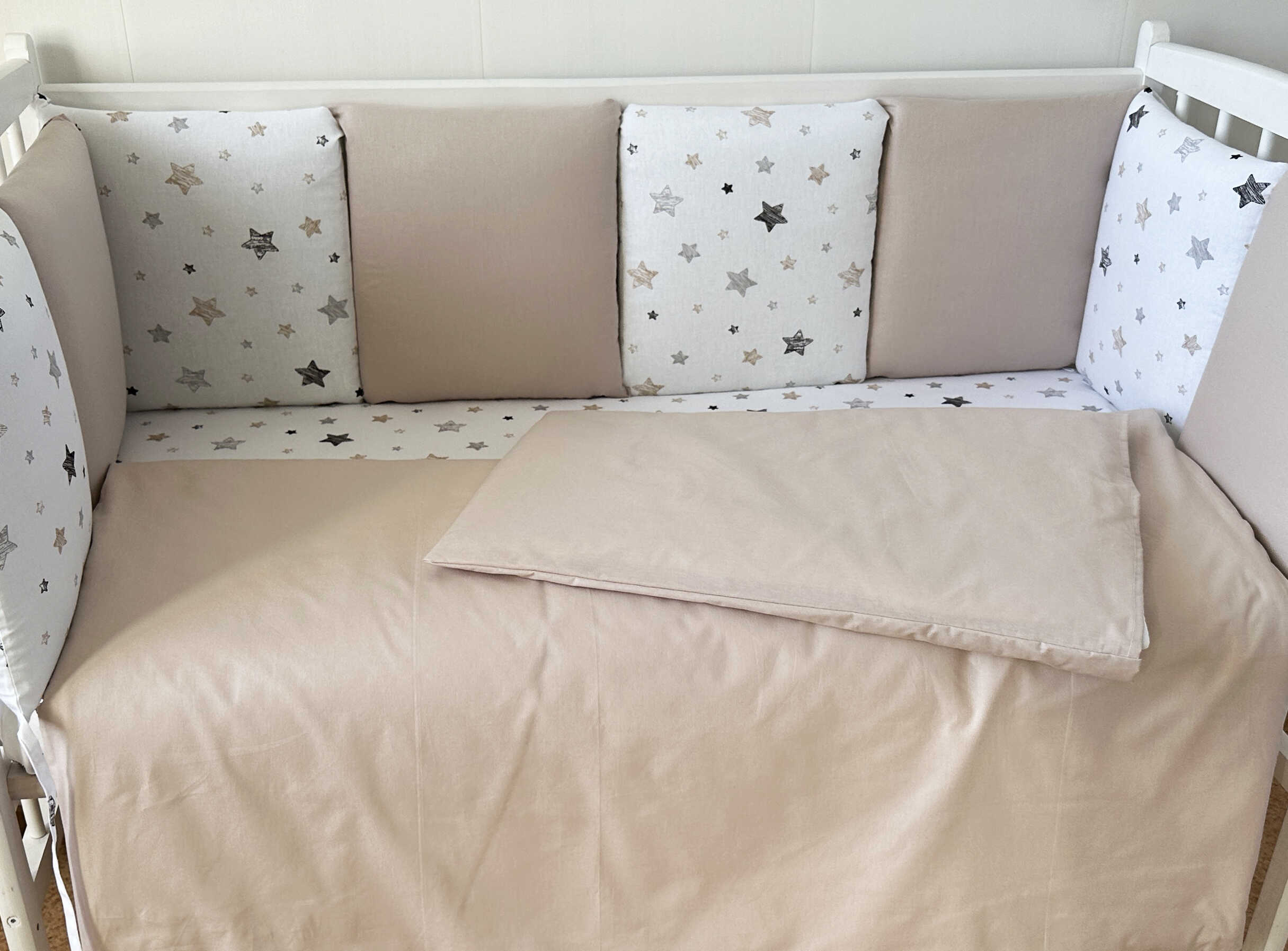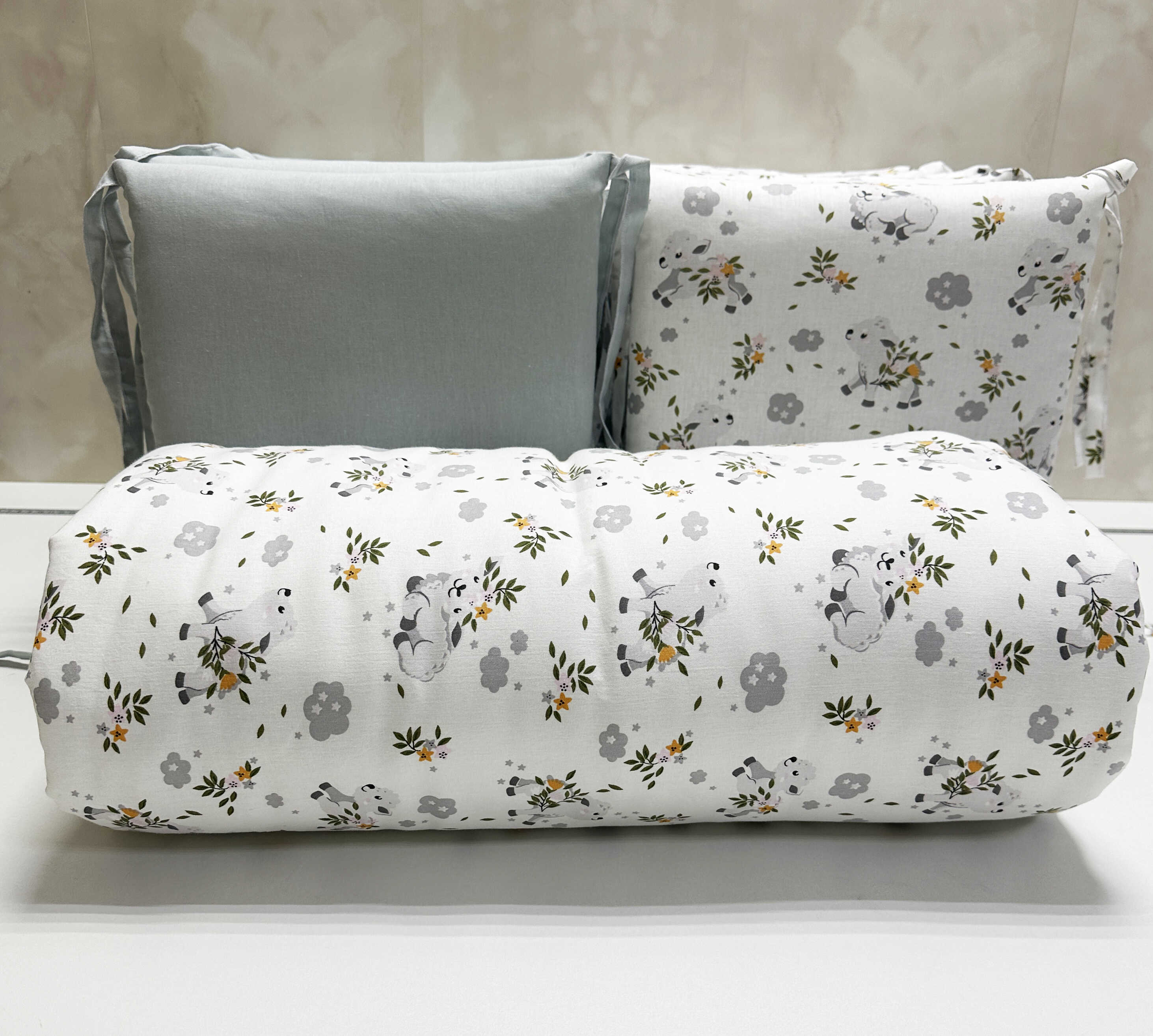 Комплекты в детскую кроватку для новорожденных с бортиками подушечками