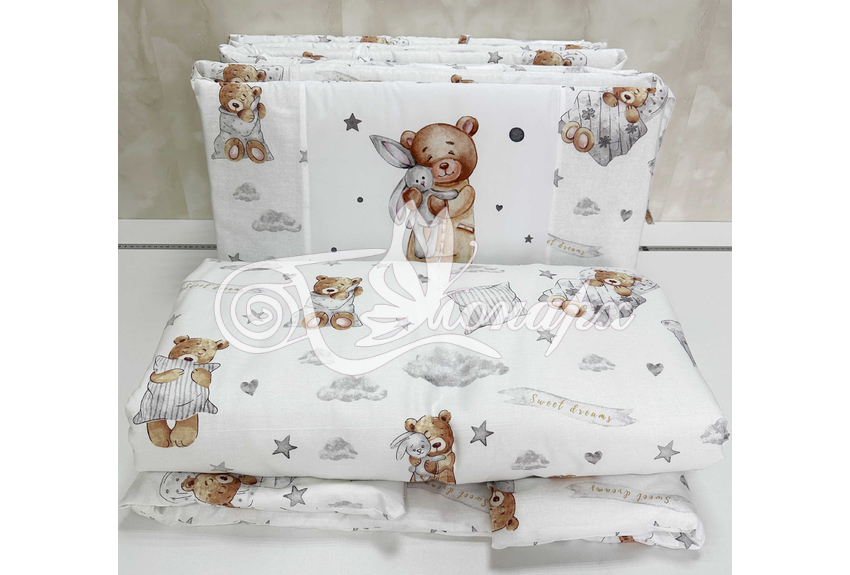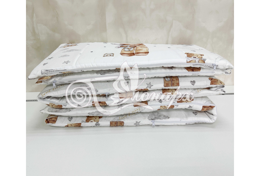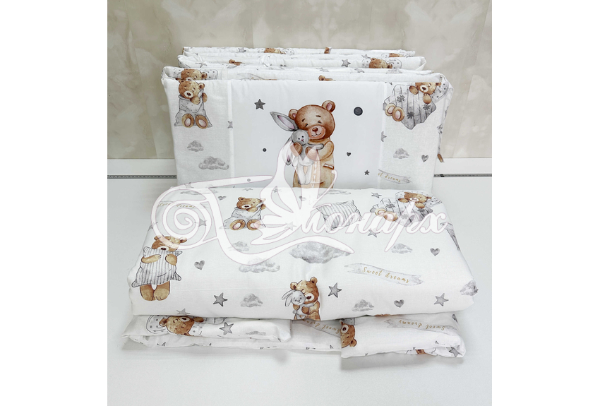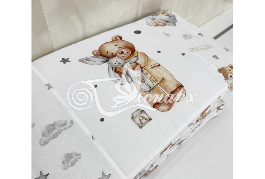 Бортики СО СЪЕМНЫМИ ЧЕХЛАМИ в кроватку: защитят Вашего малыша от ушибов, сквозняков, солнечных лучей и не дадут малышу запутаться в прутьях кроватки. - Простыня на резинке 60х120 см (подходит для стандартной кроватки)