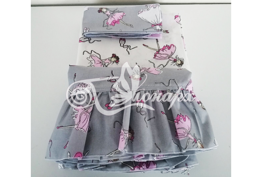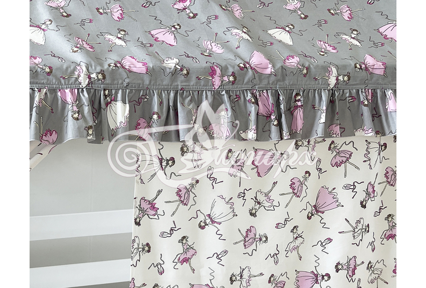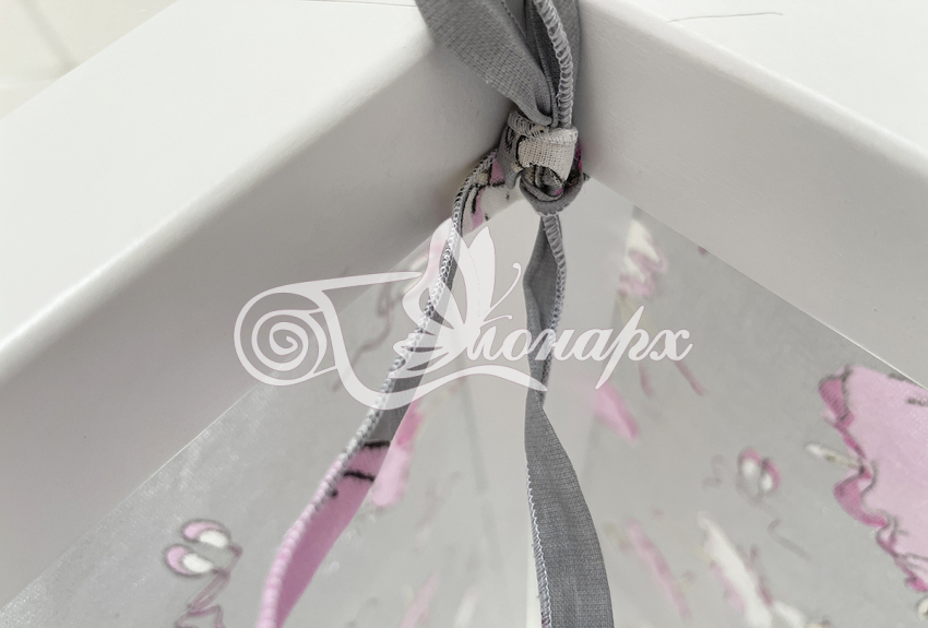 ширина - 137 см + 24 см на рюши (по 12 см на одну сторону). - Занавески с завязками (по 4 завязки на каждой занавеске) на переднюю сторону кроватки 2 шт.: