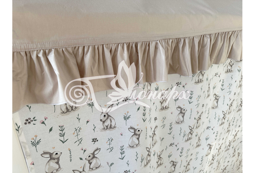 ширина - 137 см + 24 см на рюши (по 12 см на одну сторону). - Занавески с завязками (по 4 завязки на каждой занавеске) на переднюю сторону кроватки 2 шт.: