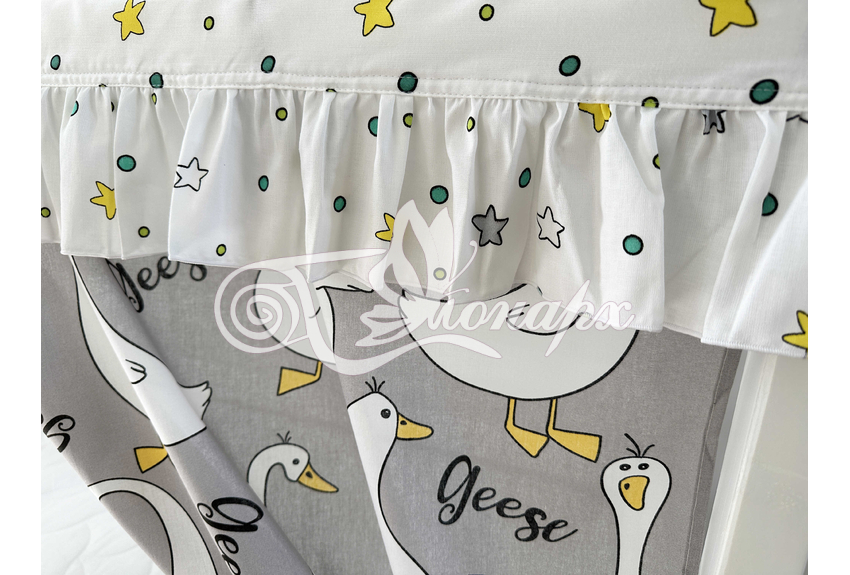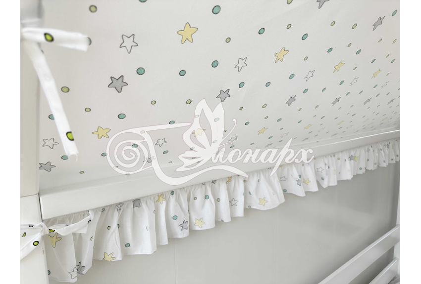 ширина - 137 см + 24 см на рюши (по 12 см на одну сторону). - Занавески с завязками (по 4 завязки на каждой занавеске) на переднюю сторону кроватки 2 шт.: