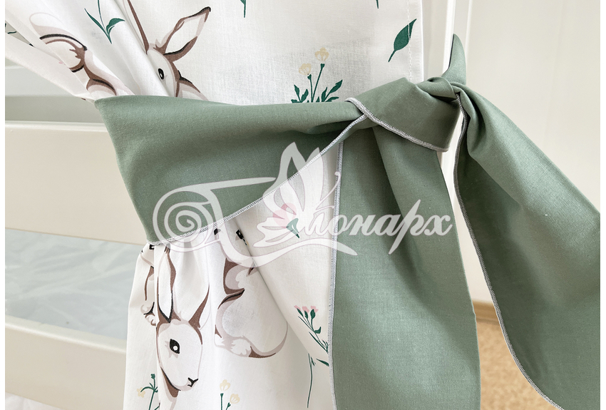 ширина - 137 см + 24 см на рюши (по 12 см на одну сторону). - Занавески с завязками (по 4 завязки на каждой занавеске) на переднюю сторону кроватки 2 шт.: